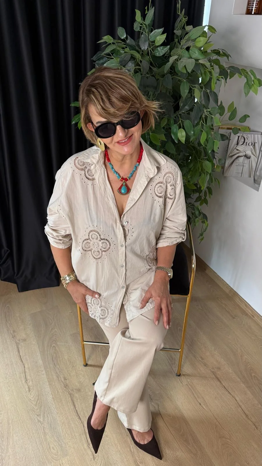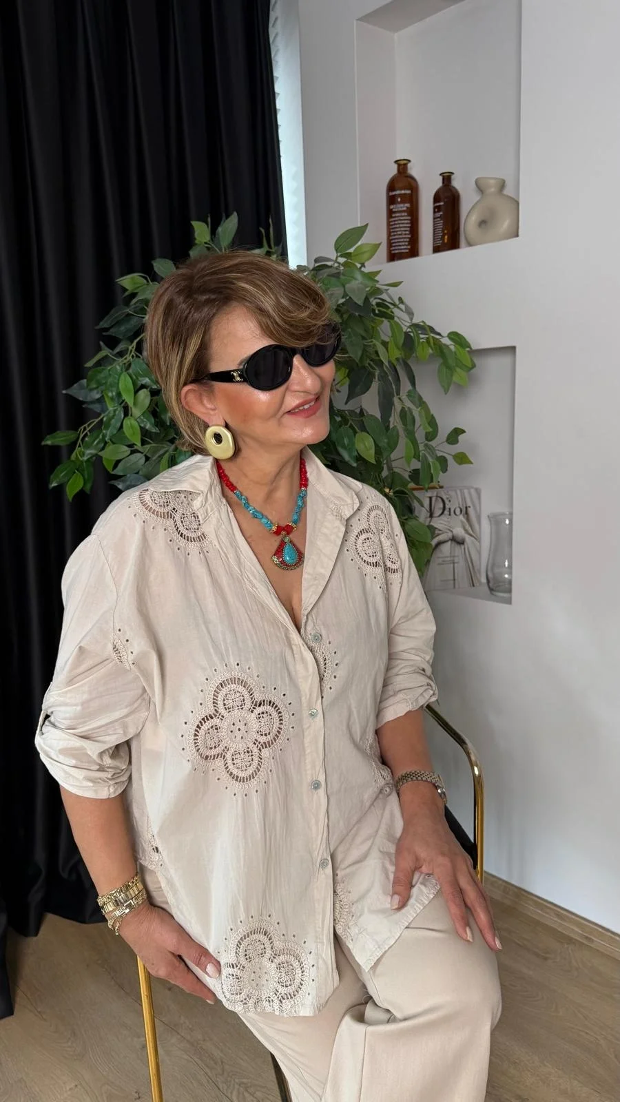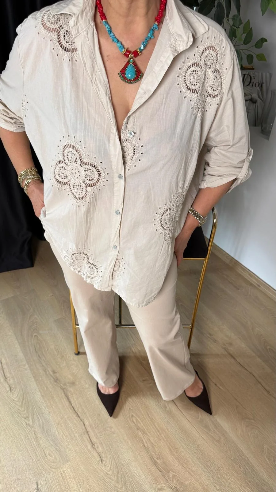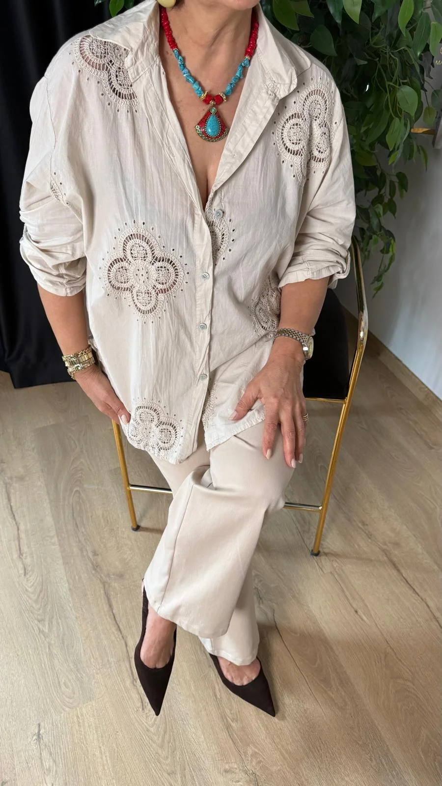 Bej 4 Yapraklı Yonca Desen Dantelli Gömlek 25005