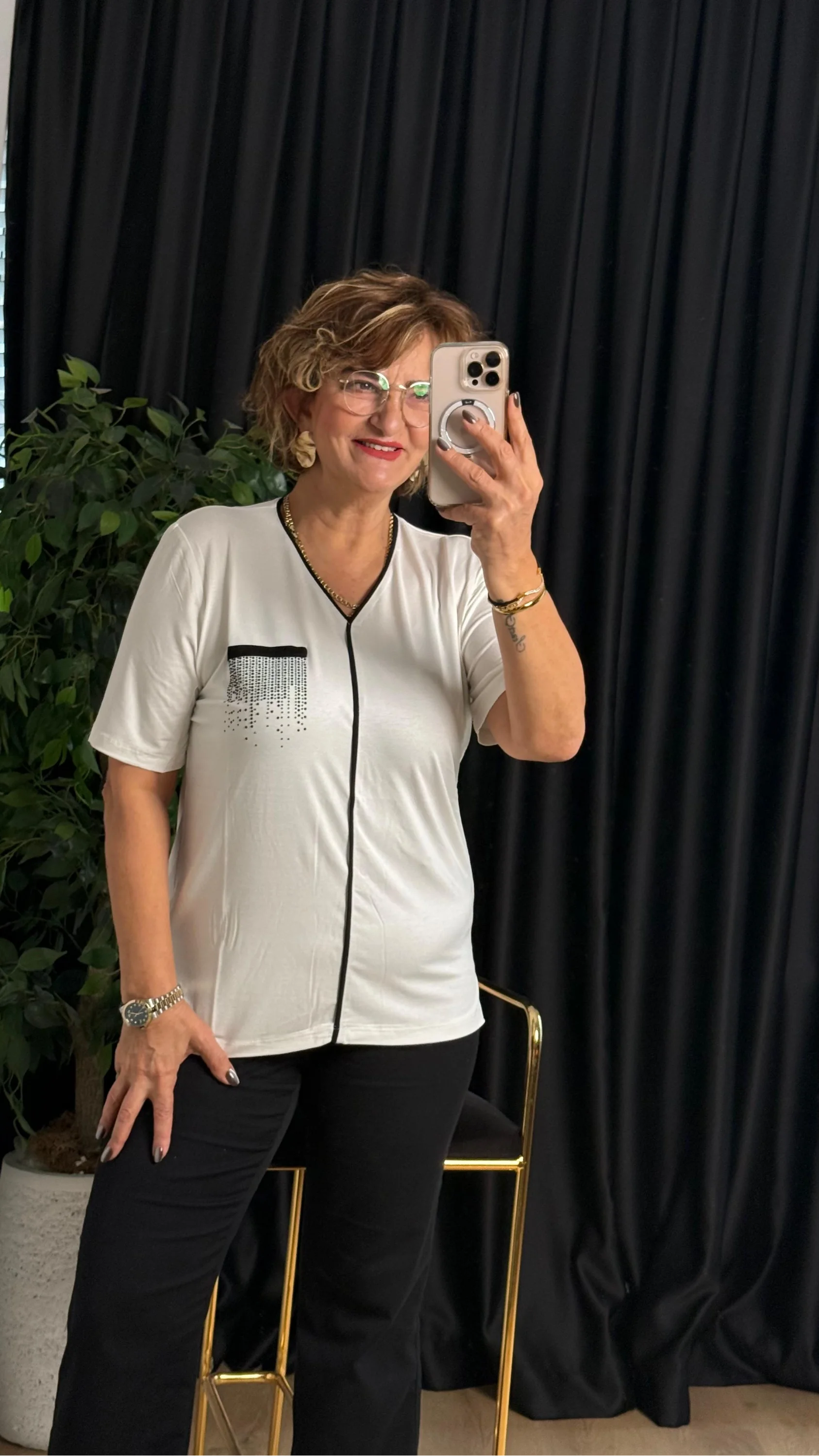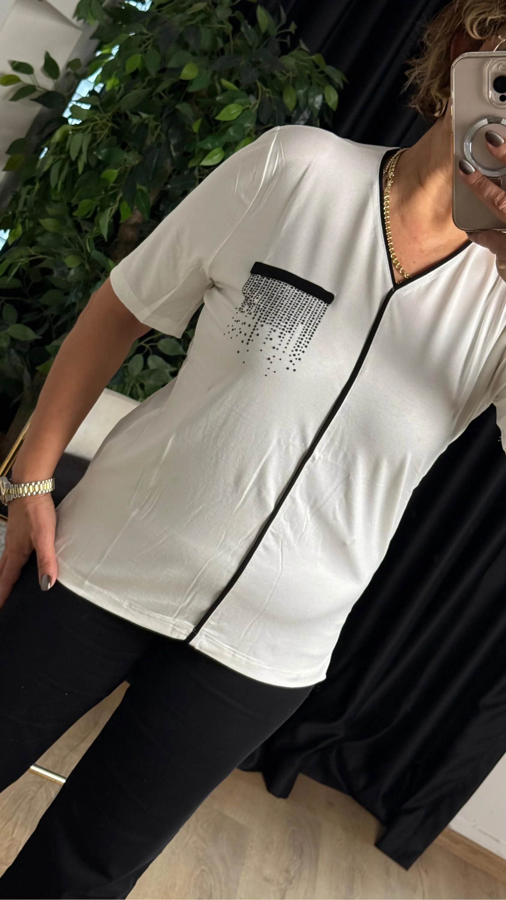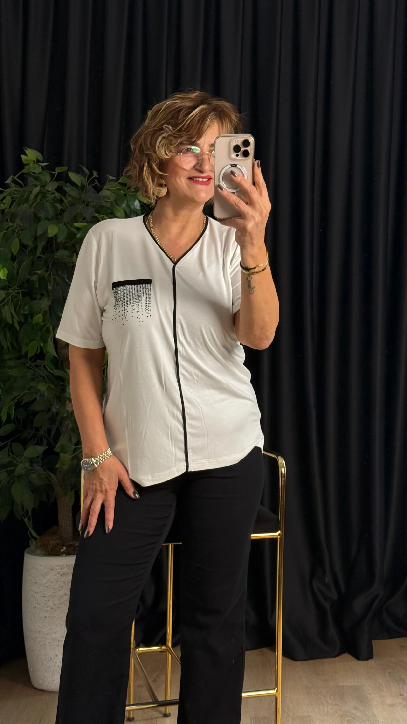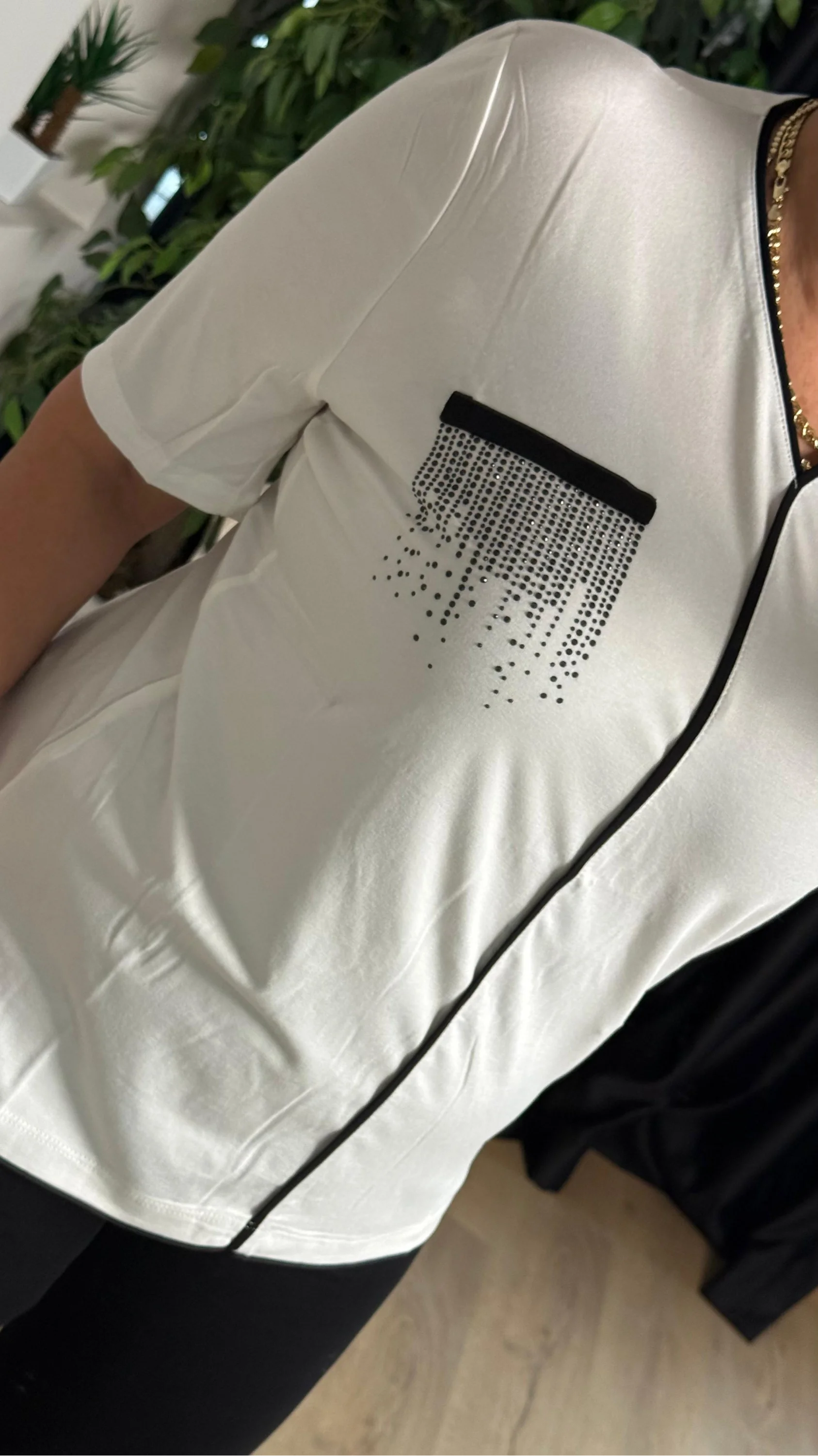 Ekru V Yaka Şeritli Kısa Kol Bluz 25Y6009