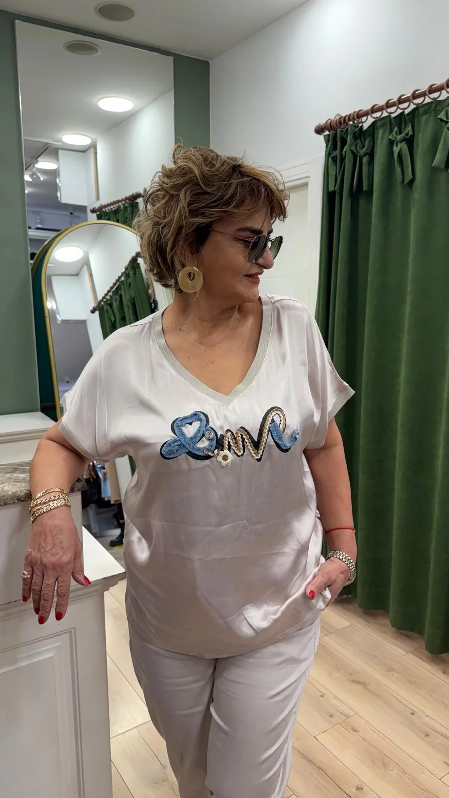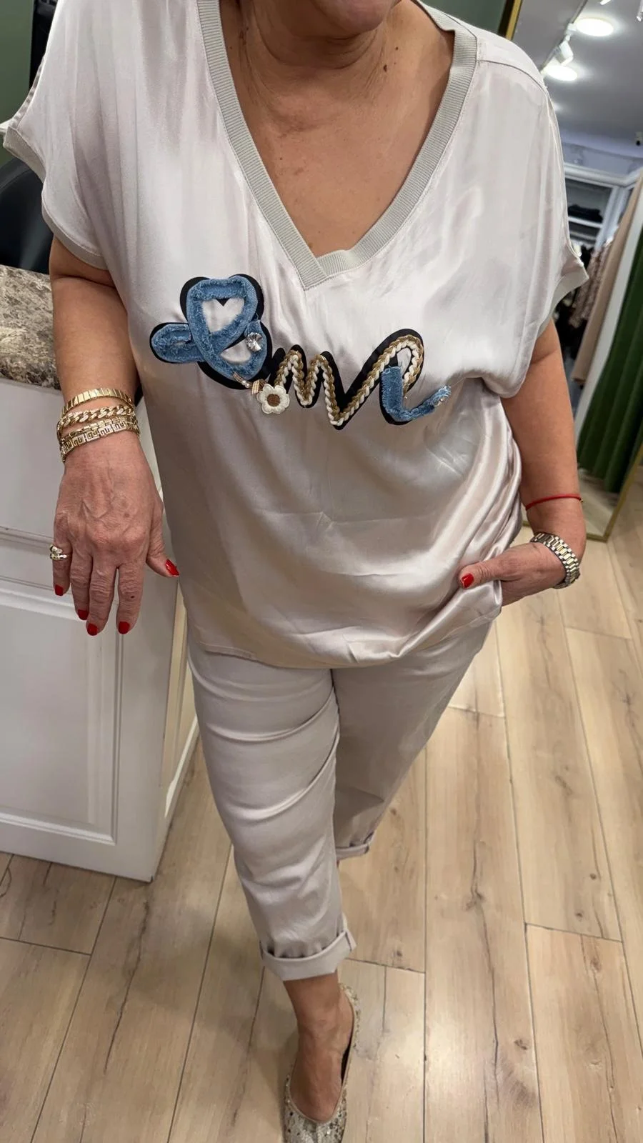 Krem Desenli Saten Bluz LVD