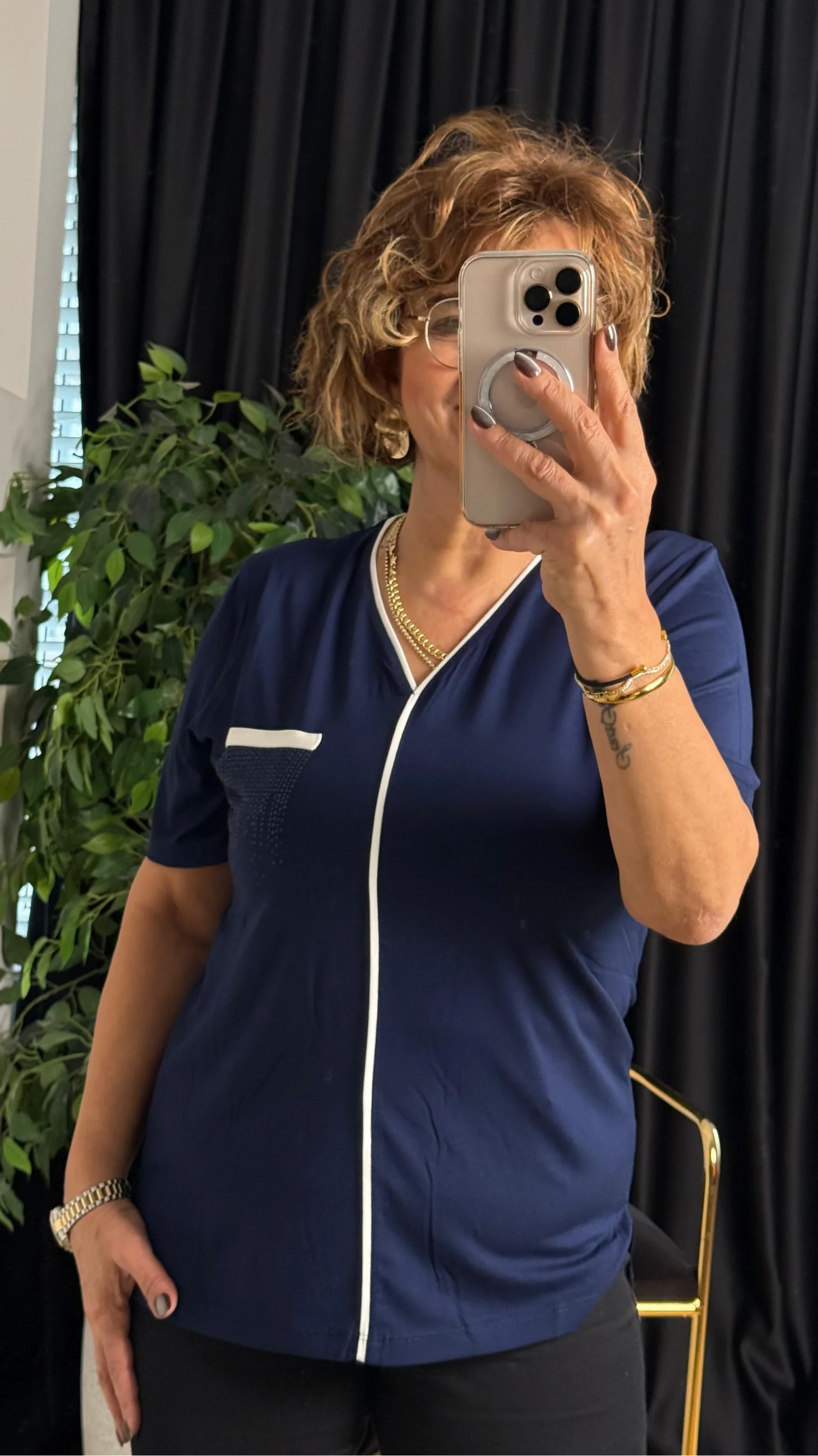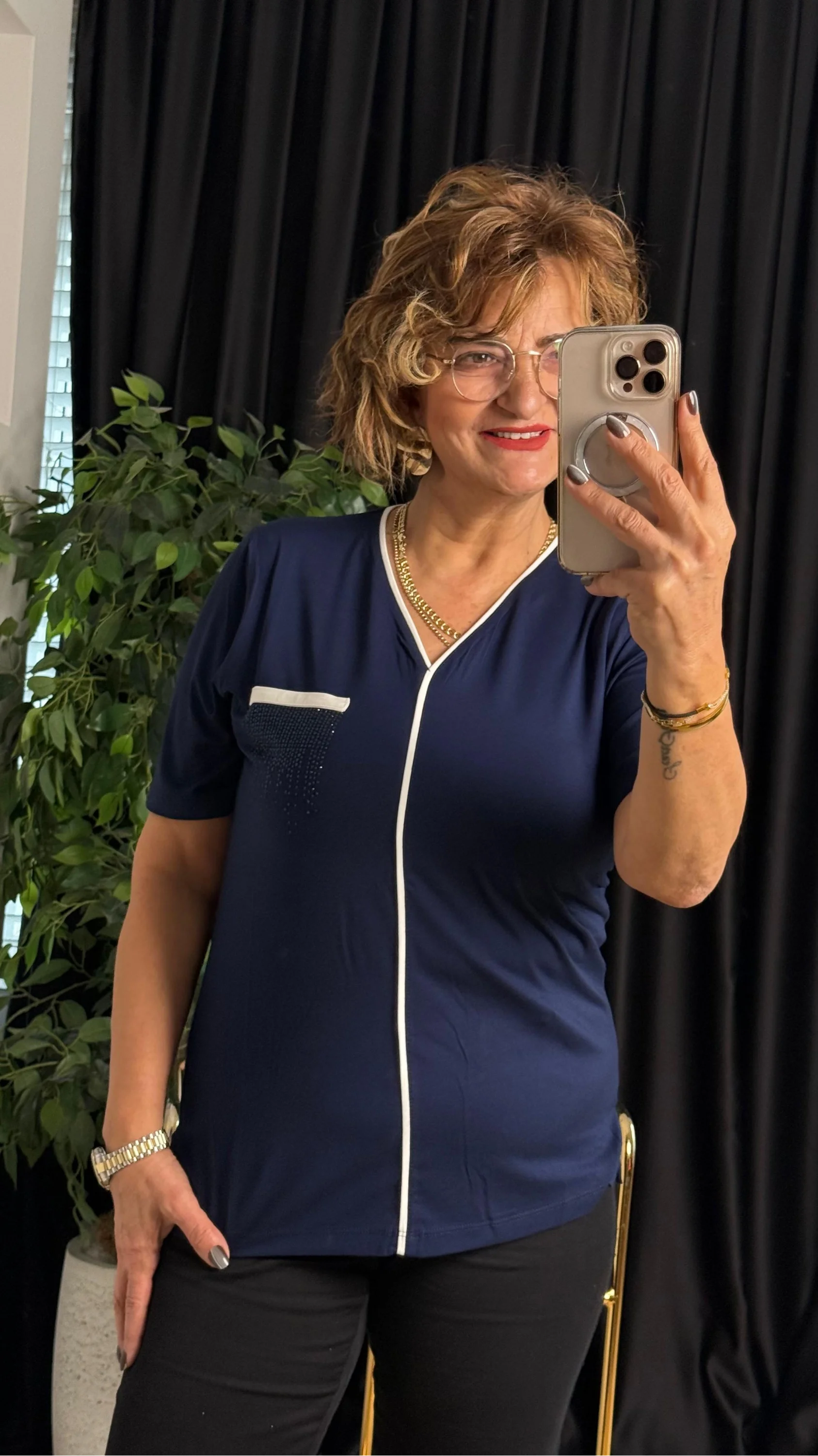 Lacivert V Yaka Şeritli Kısa Kol Bluz 25Y6009