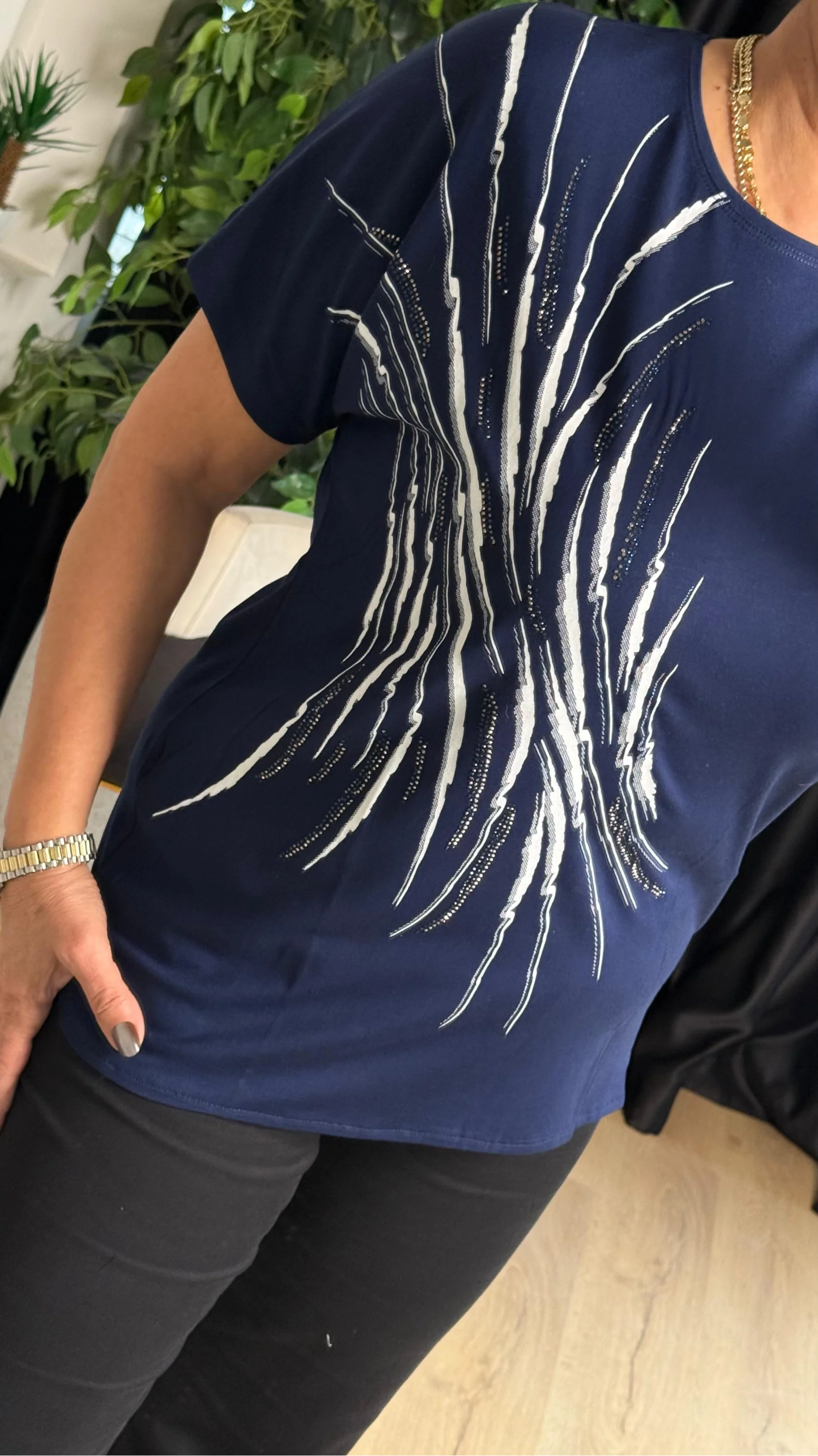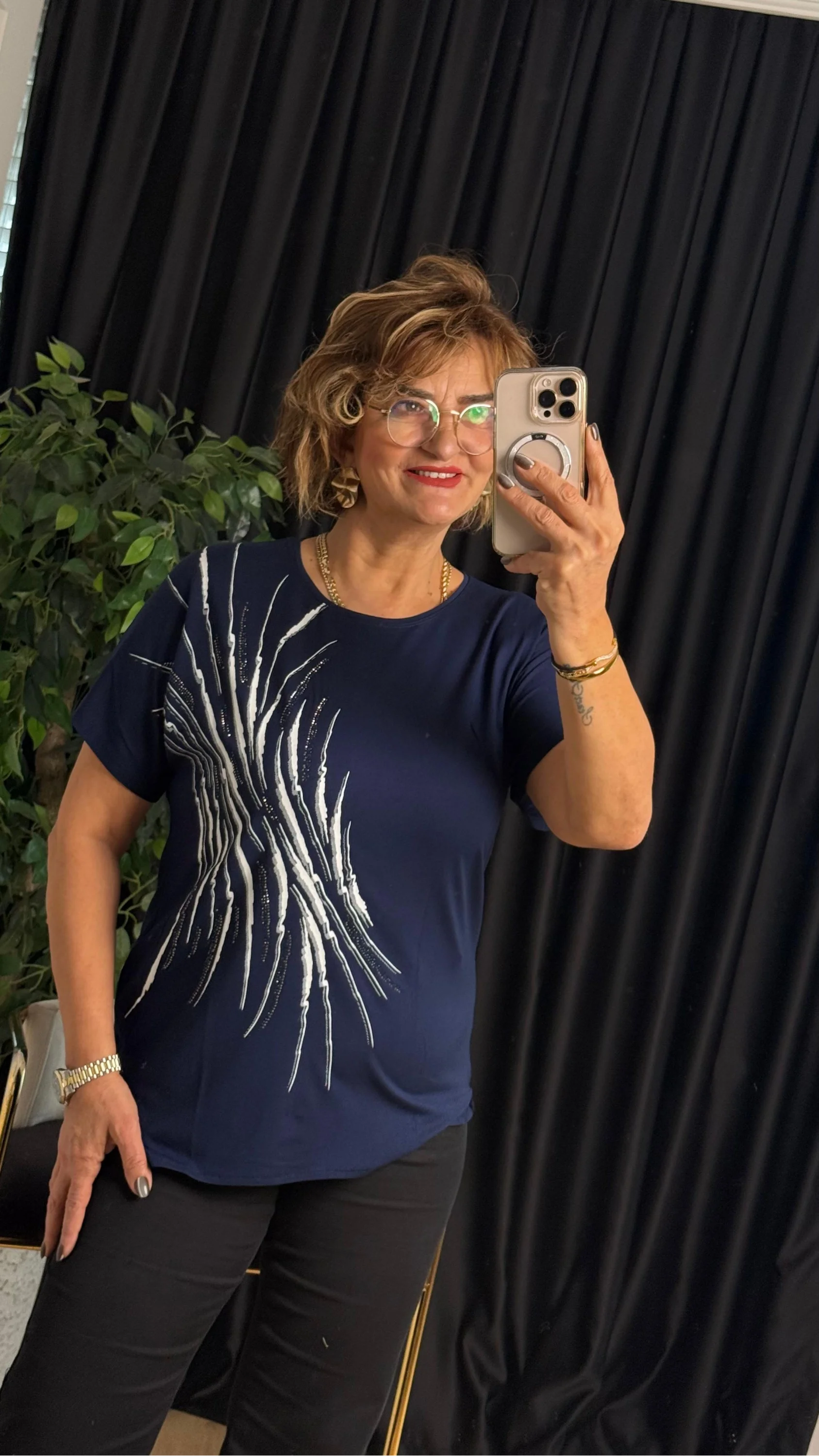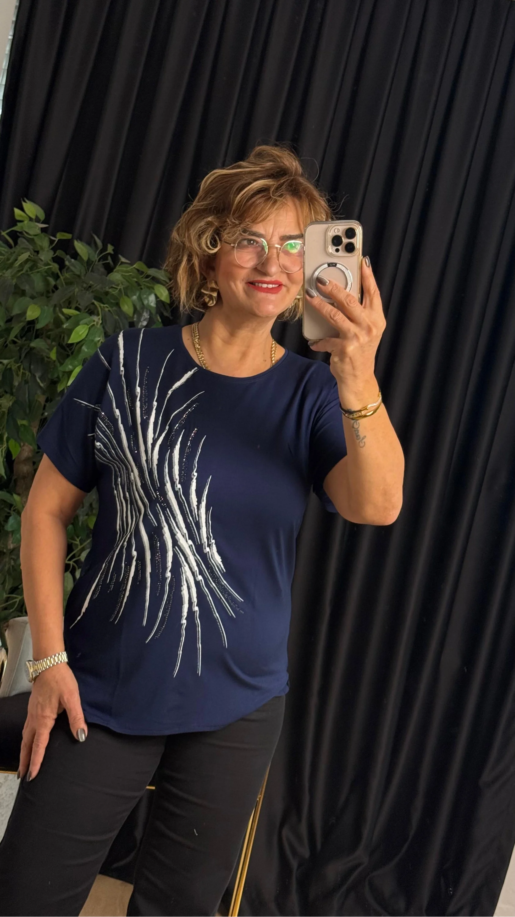 Lacivert Yuvarlak Yaka Taşlı Kısa Kol Bluz 25Y6025