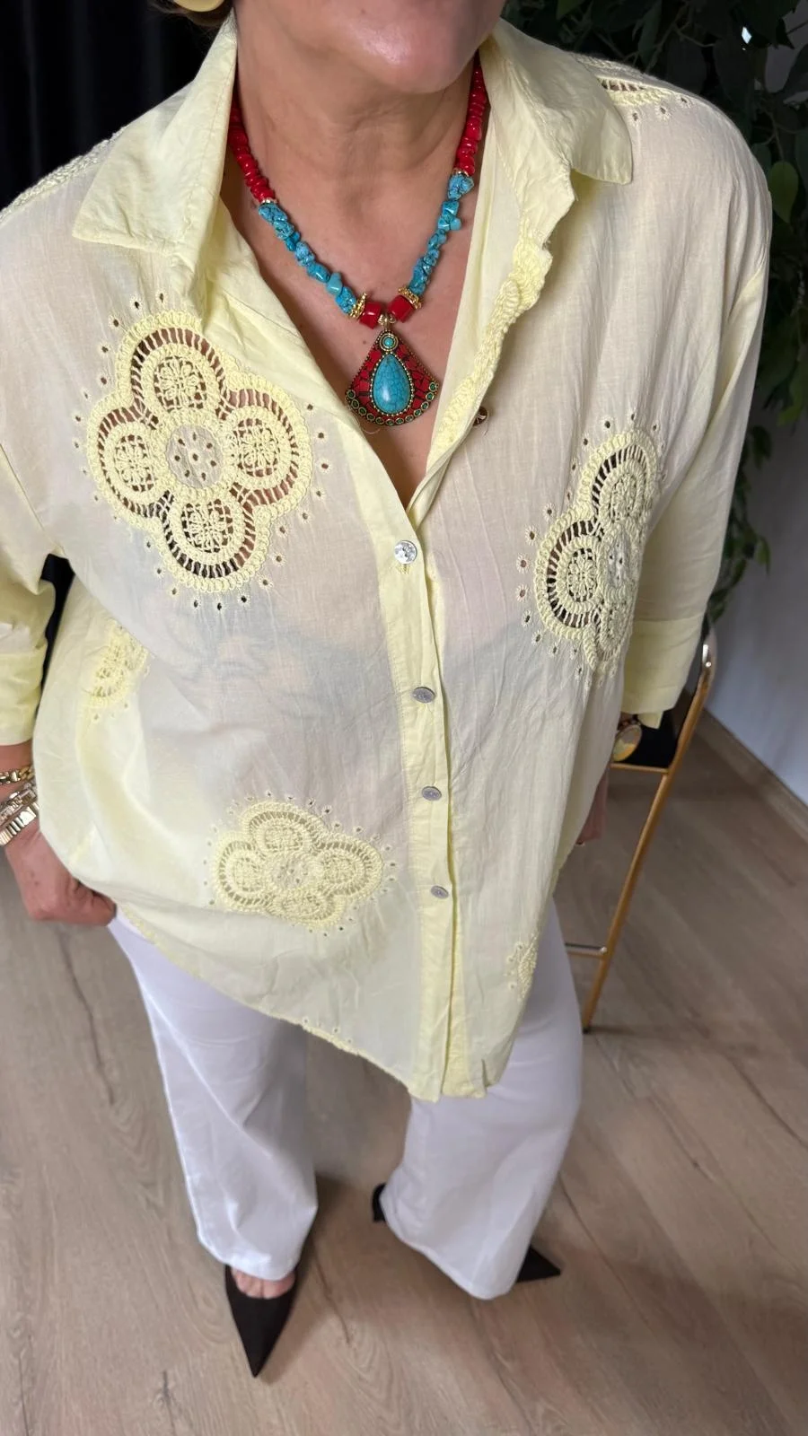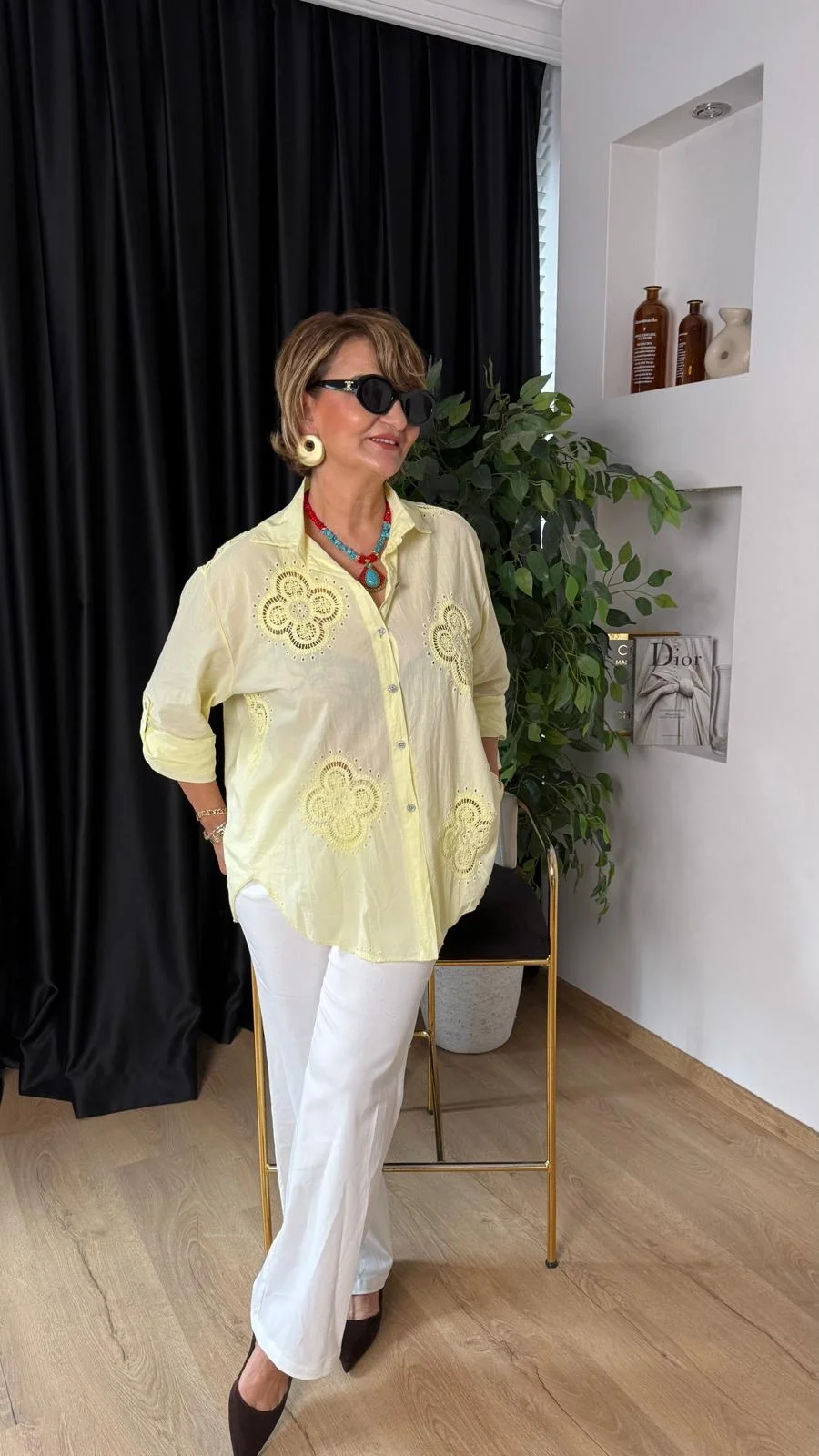 Sarı 4 Yapraklı Yonca Desen Dantelli Gömlek 25005