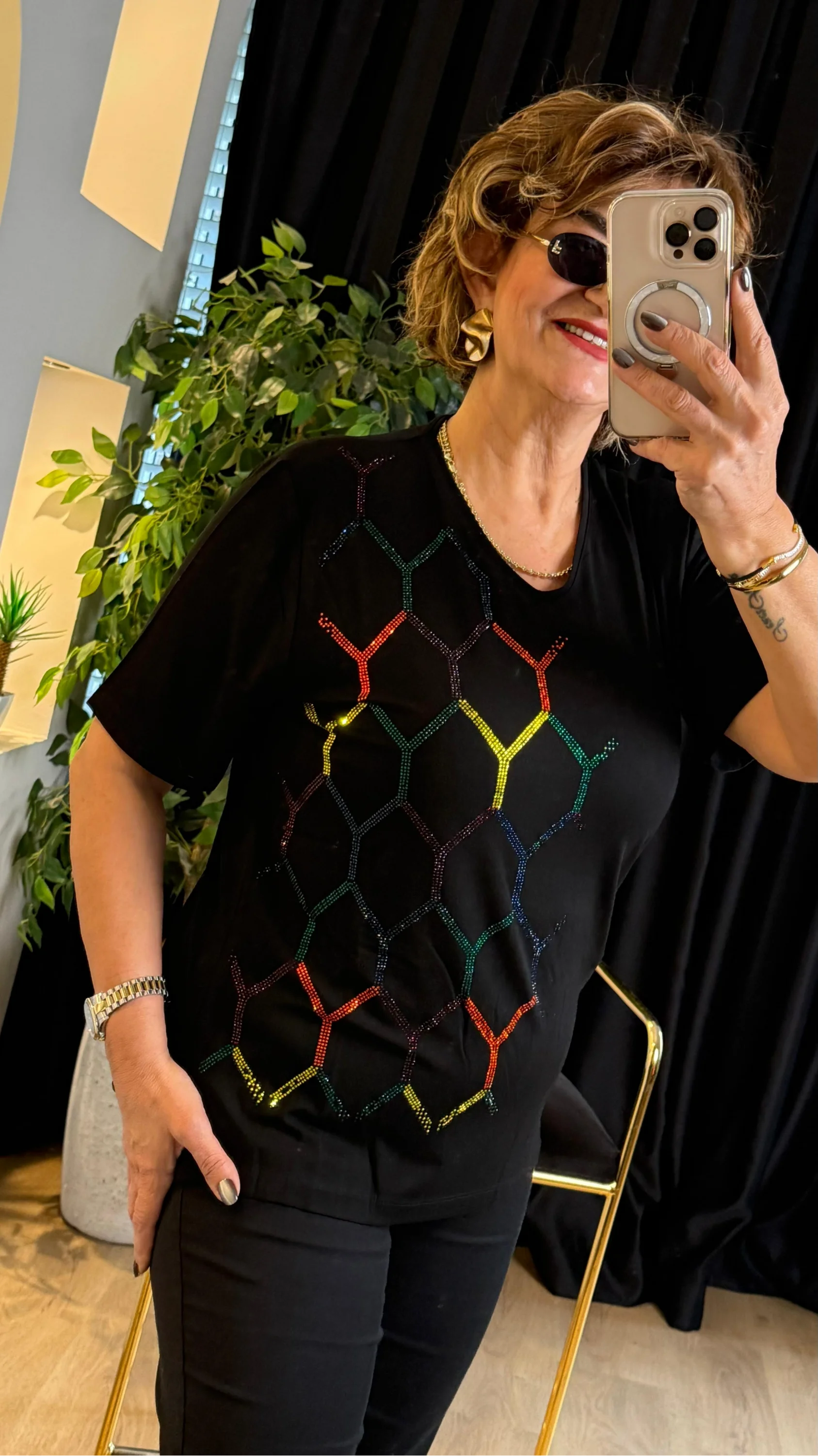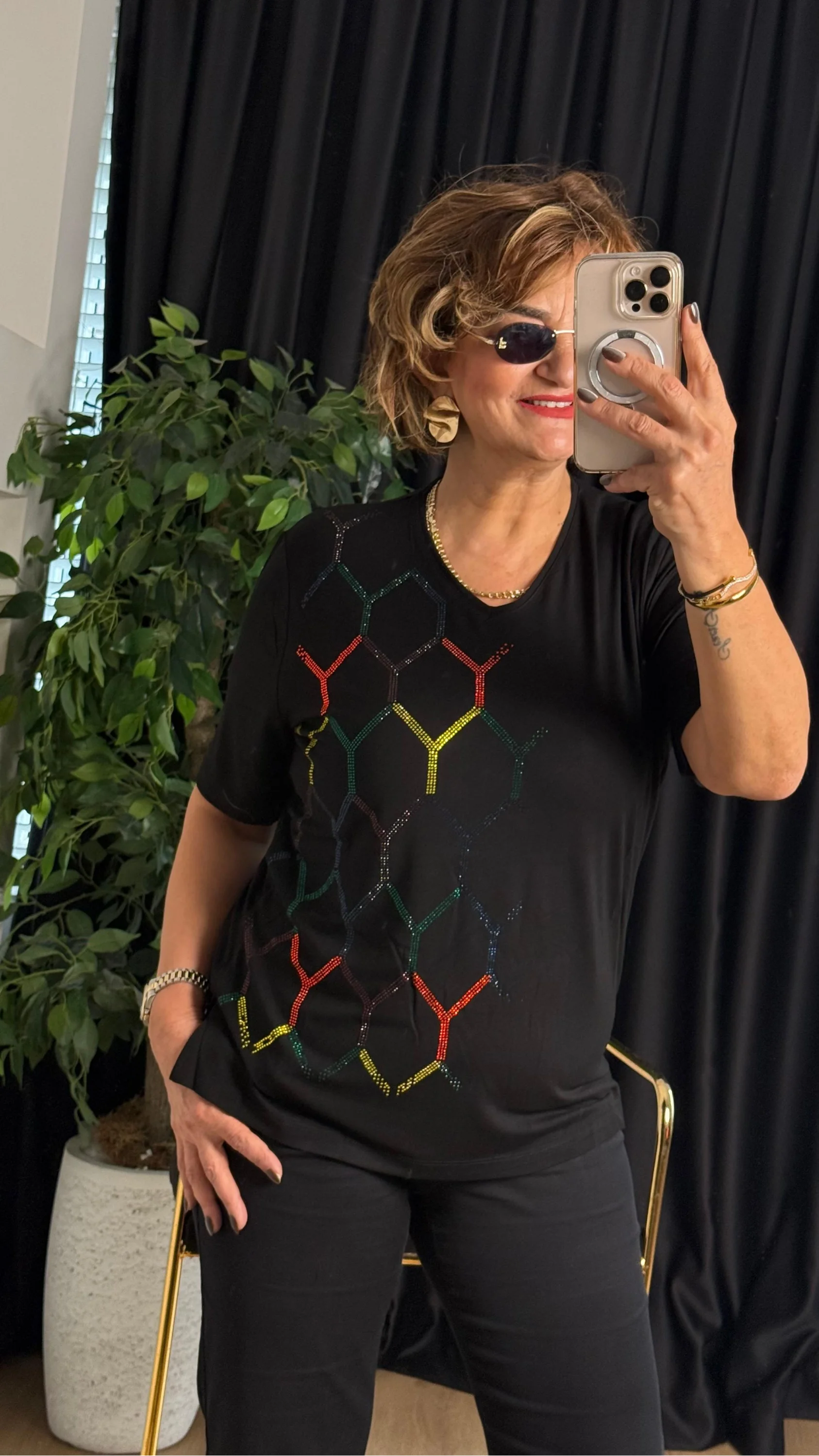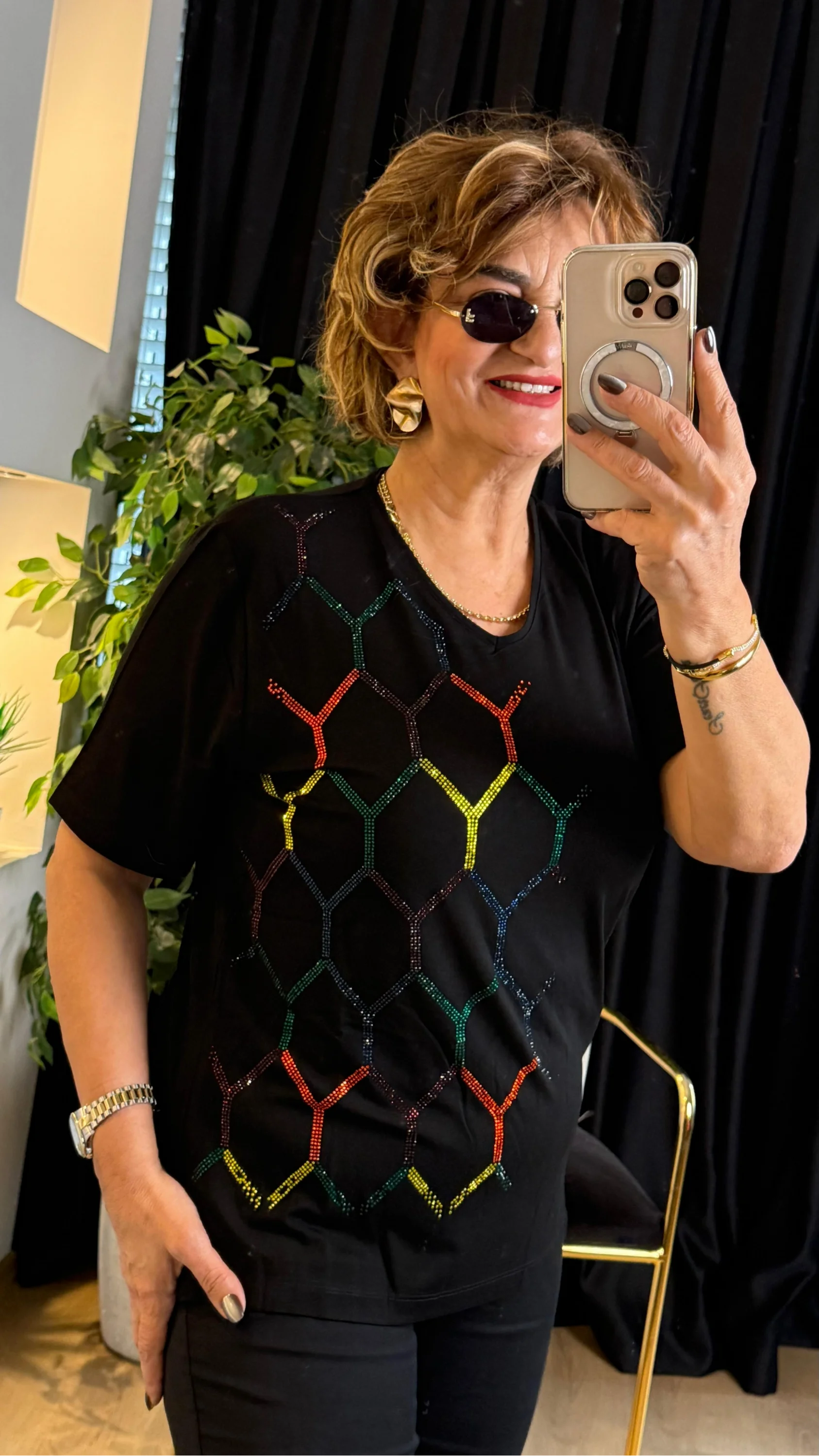 Siyah V Yaka Taşlı Kısa Kol Bluz 25Y6001
