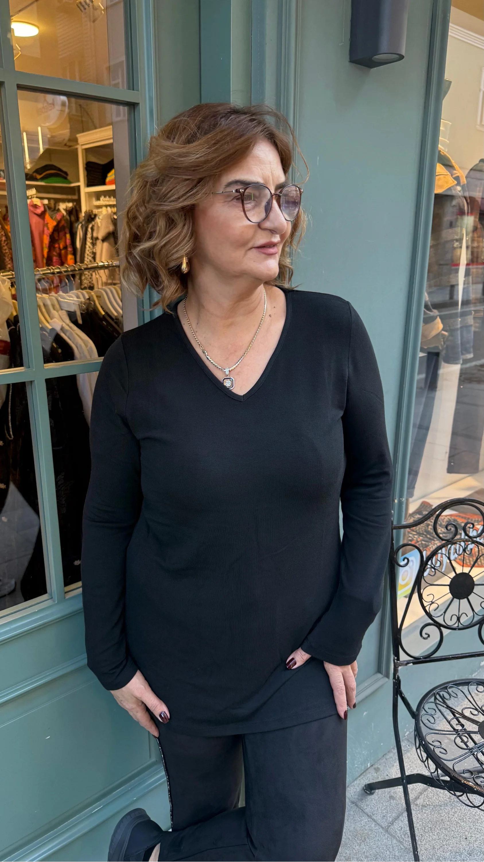 Siyah V Yaka Yırtmaçlı Basıc Kazak 20513