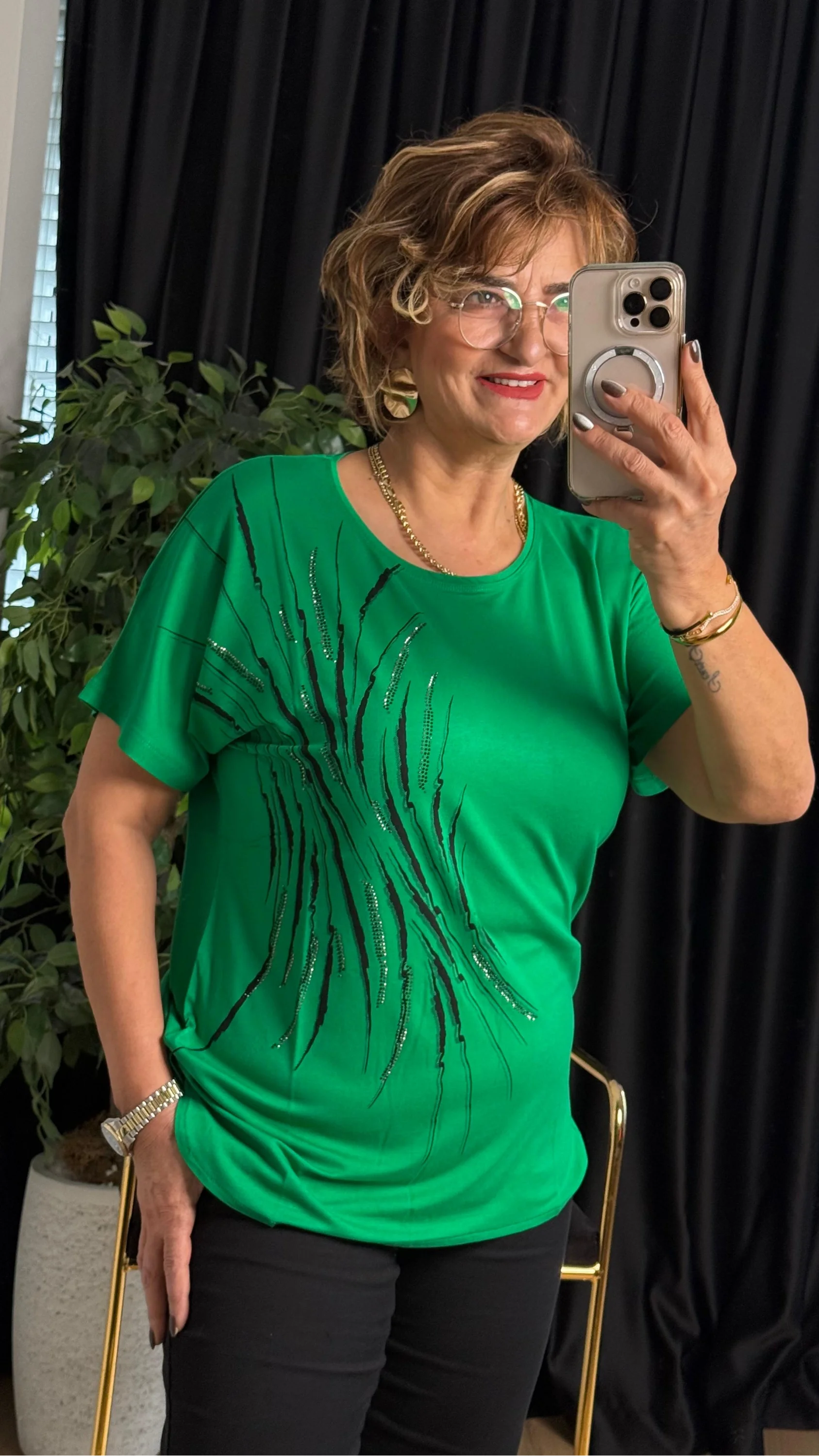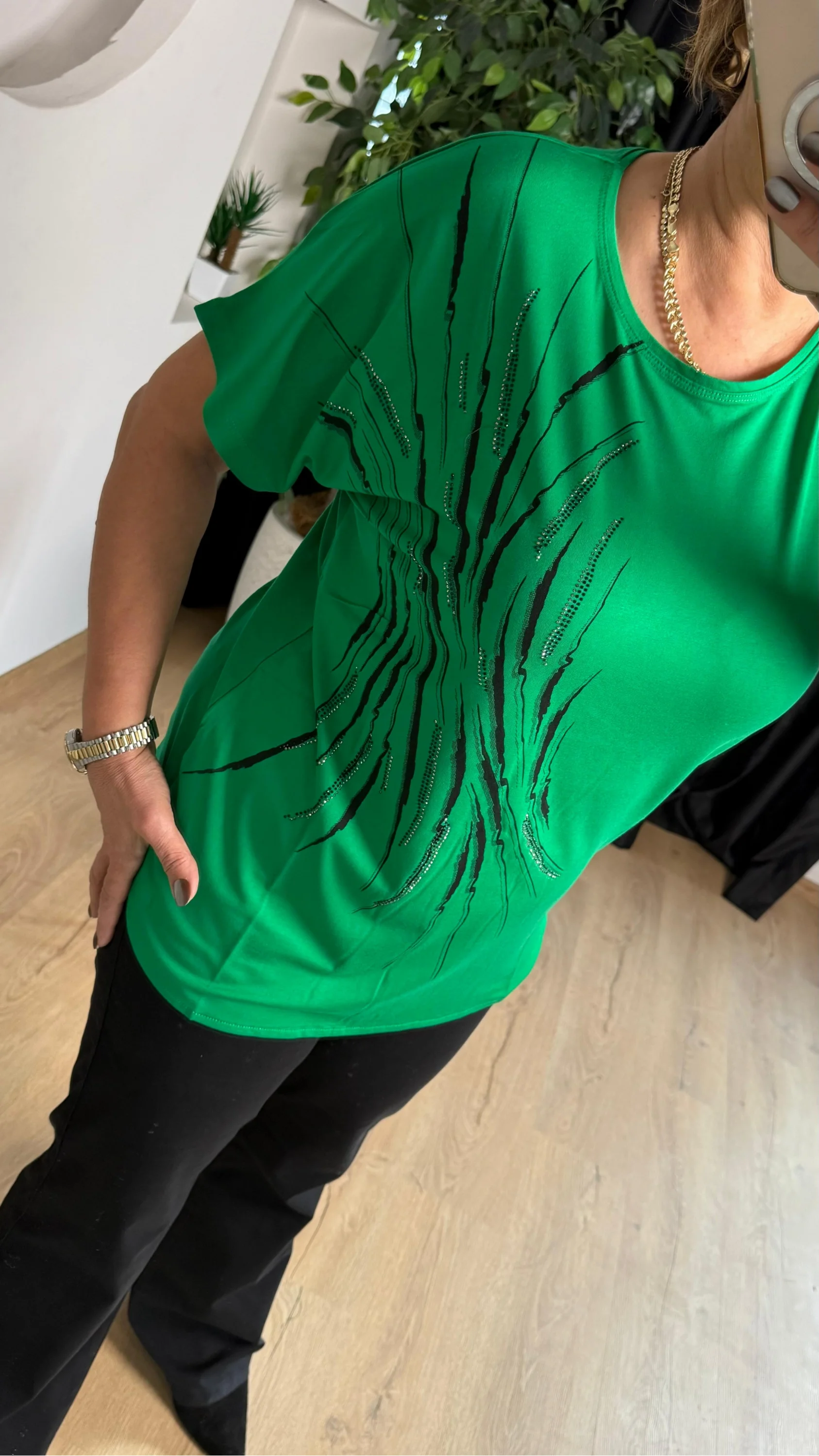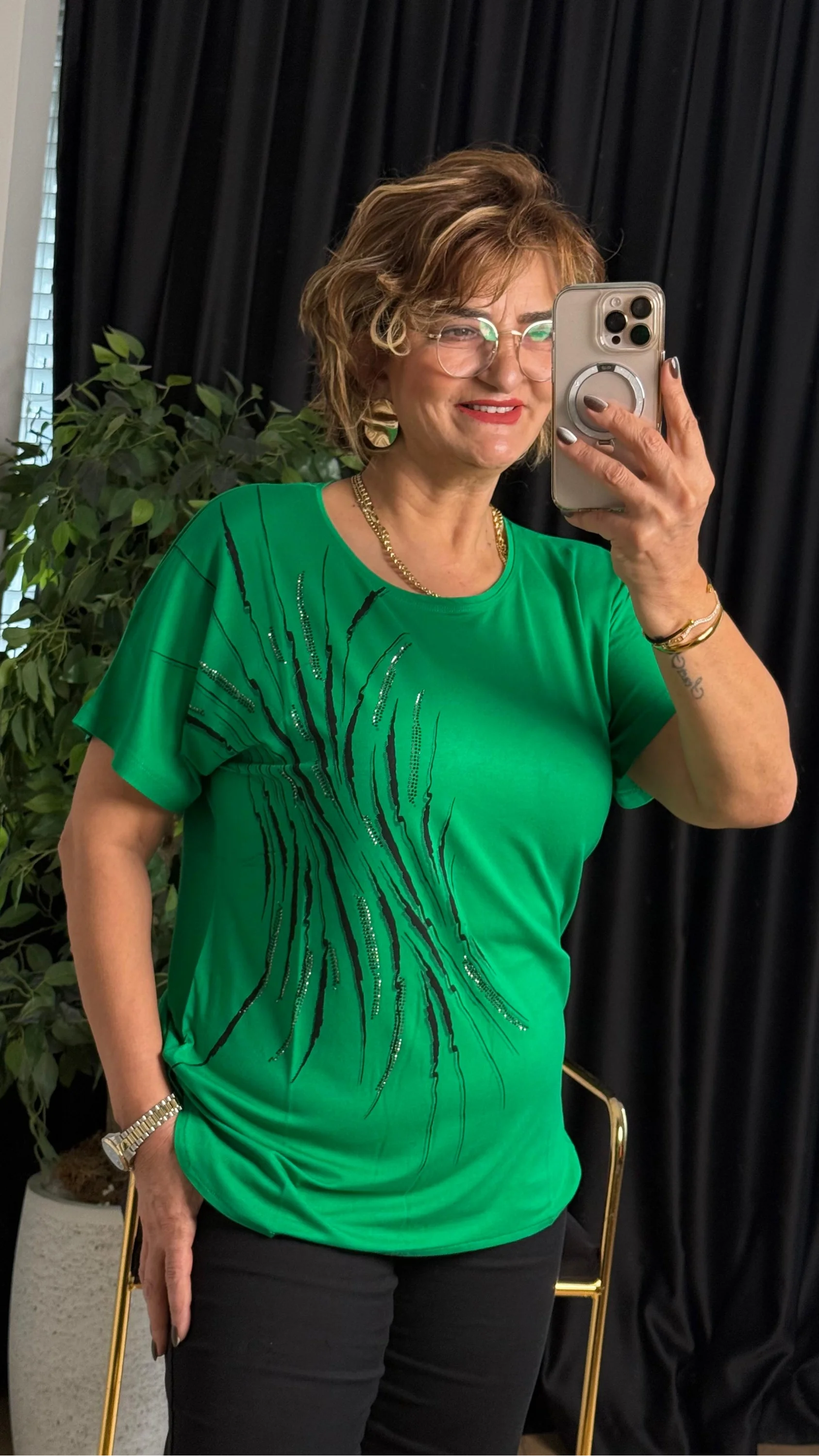 Yeşil Yuvarlak Yaka Taşlı Kısa Kol Bluz 25Y6025